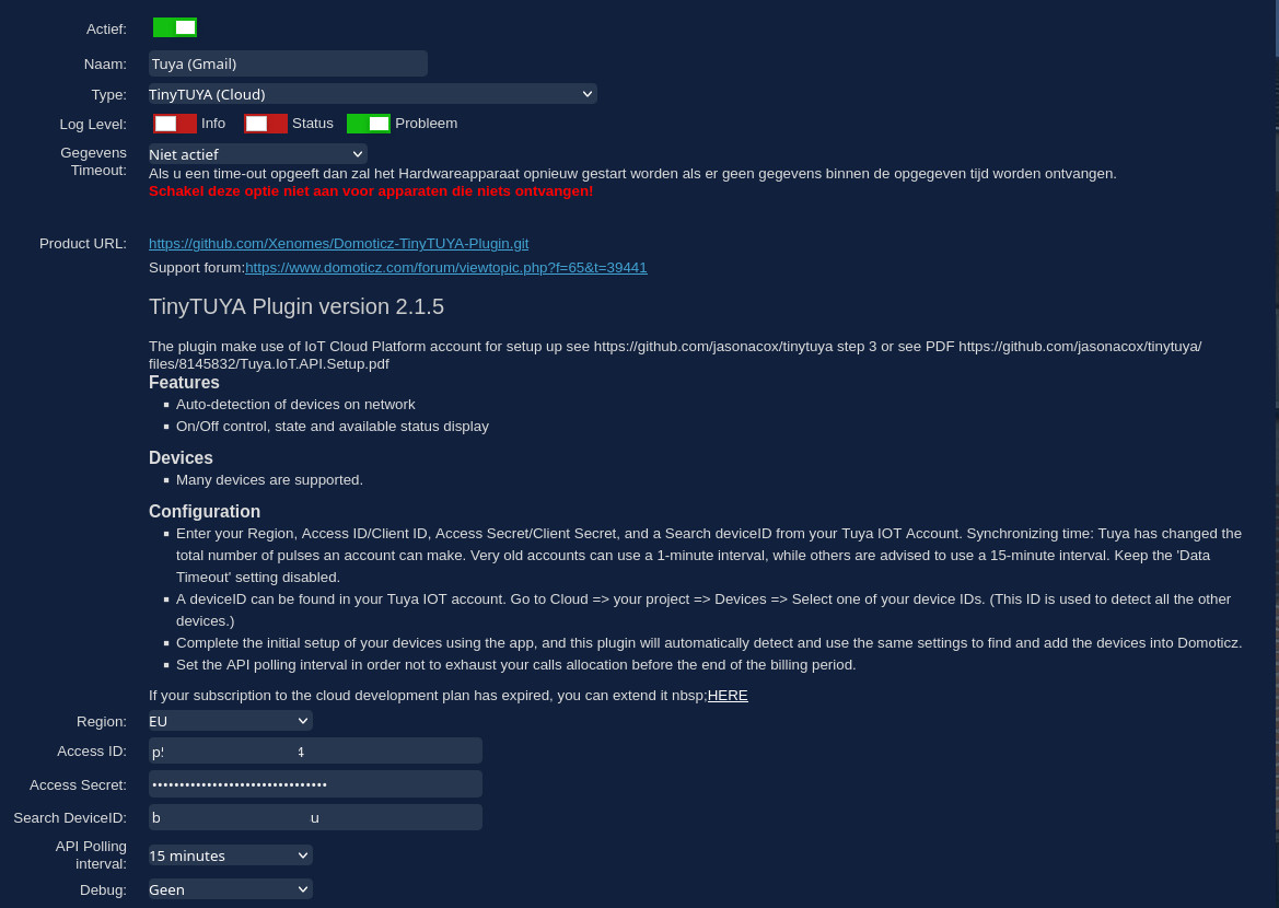 Installeer de Tuya plugin: https://github.com/Xenomes/Domoticz-TUYA-Plugin Hoe je een plug-in installeert in Domoticz staat hier.