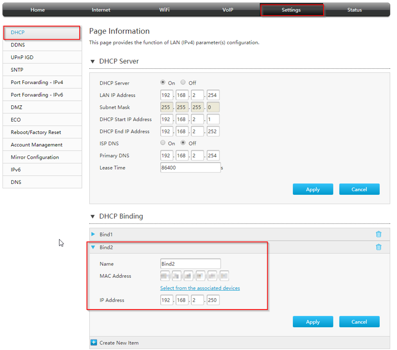 Maak nu een DHCP Binding, geef het een zinnige naam en selecteer het macadress (selecteer uit de lijst). Het IP adres dat dit device krijgt tobedeeld is 192.168.2.250 (???waarom niet buiten de dhcp range??)