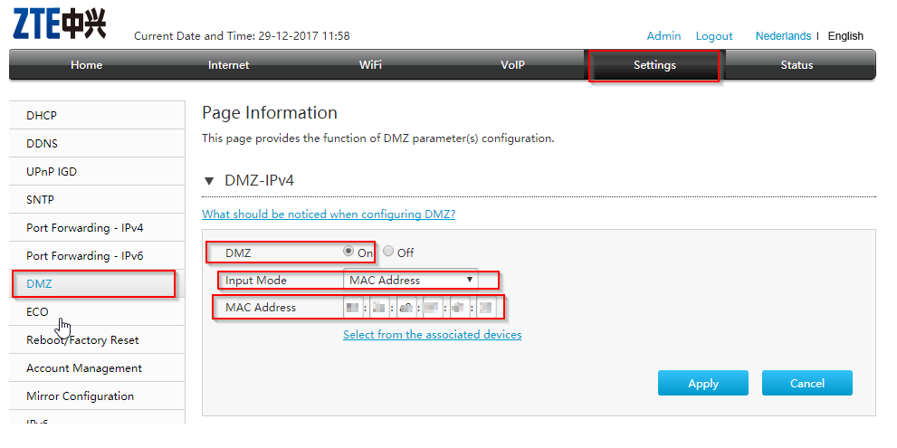 De instellingen voor de Experiabox die je aan moet passen: configureer eerst de DMZ