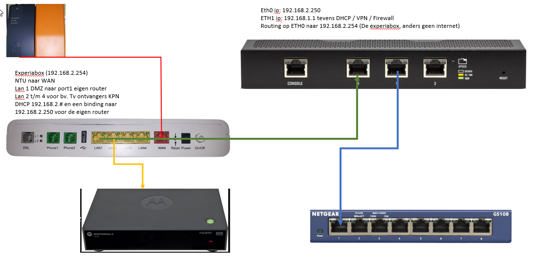 Het achterliggende idee is dat je al het internetverkeer via 1 specifieke poort (LAN1) door stuurt naar je eigen netwerk. Op de Experiabox blijven dan nog 3 poorten over  (LAN2 .. LAN4). Deze gebruik je voor je TV(s) en/of een aparte computer als er wat aan de hand is. KPN verwacht namelijk dat je je computers, en wat al niet meer zijt, op deze LAN poorten aansluit.